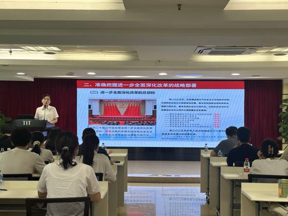 8月27日,九游在线官网j9团委书记梁晨在广德大厦15楼会议室为各团组织书记、委员,本部及纺出公司团员青年,2024年新入职管培生共47人作学习贯彻党的二十届三中全会精神专题宣讲。在宣讲过程中,梁晨通过鲜活的语言、生动的案例,从深刻把握进一步全面深化改革的重要性和必要性,深刻认识进一步全面深化改革的指导思想和总目标、重大原则、重要部署,认真落实进一步全面深化改革的实践要求等方面深入浅出地对全会精神进行了系统阐述和解读。